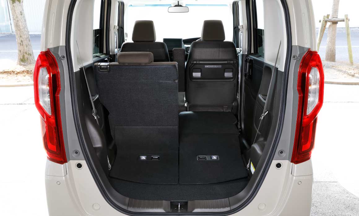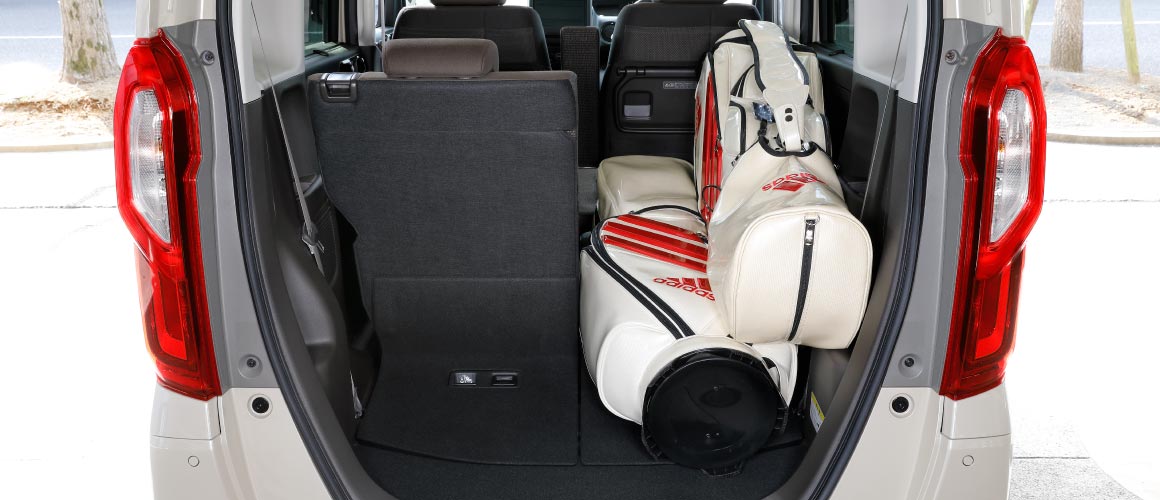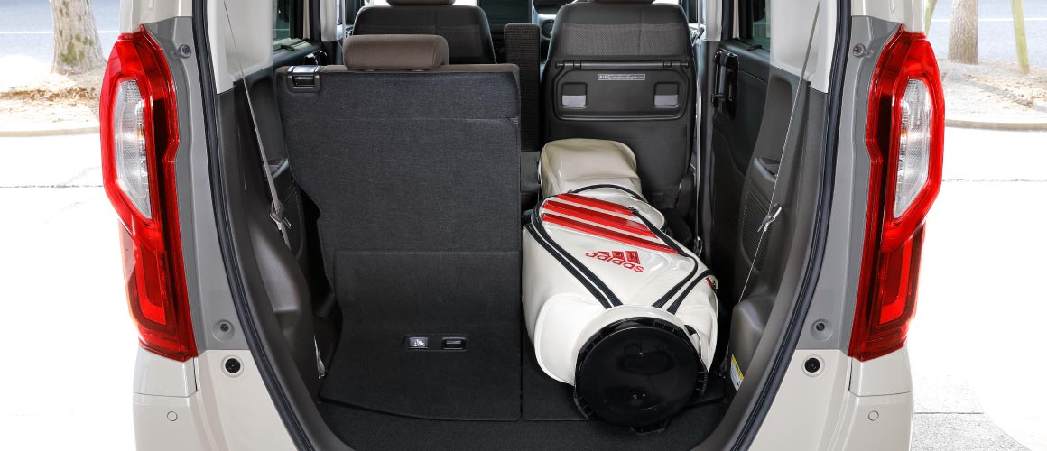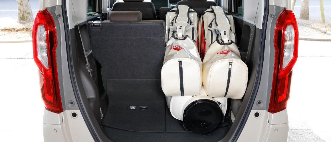 リアシート肩口の操作レバーを引くだけのワンアクションで、片側の背もたれを前に倒せば、ゴルフバッグ3個をしっかり載せられます。荷室床面も低いため、バッグを高く持ち上げずに、スムーズに出し入れできます。