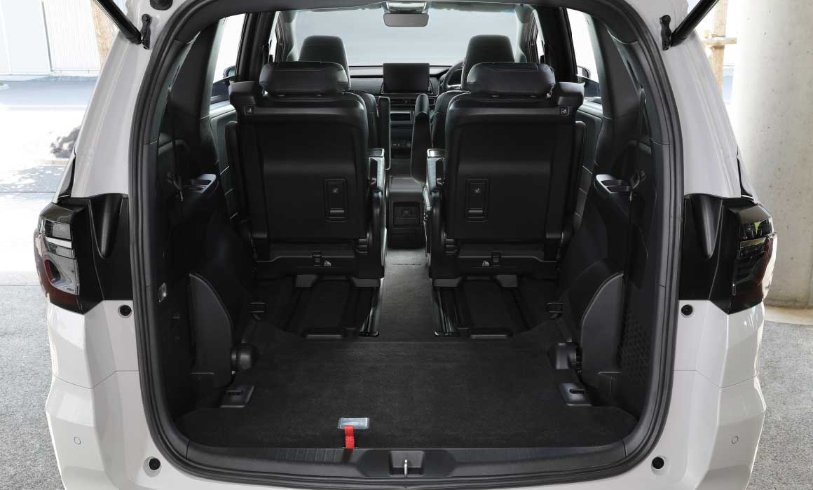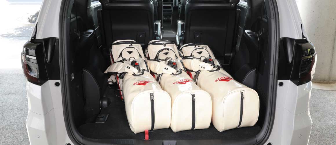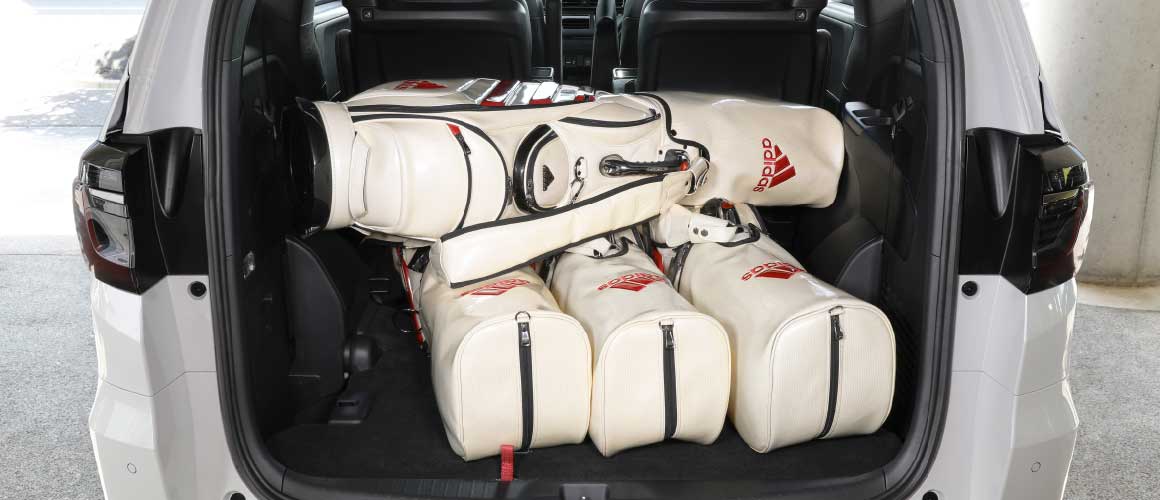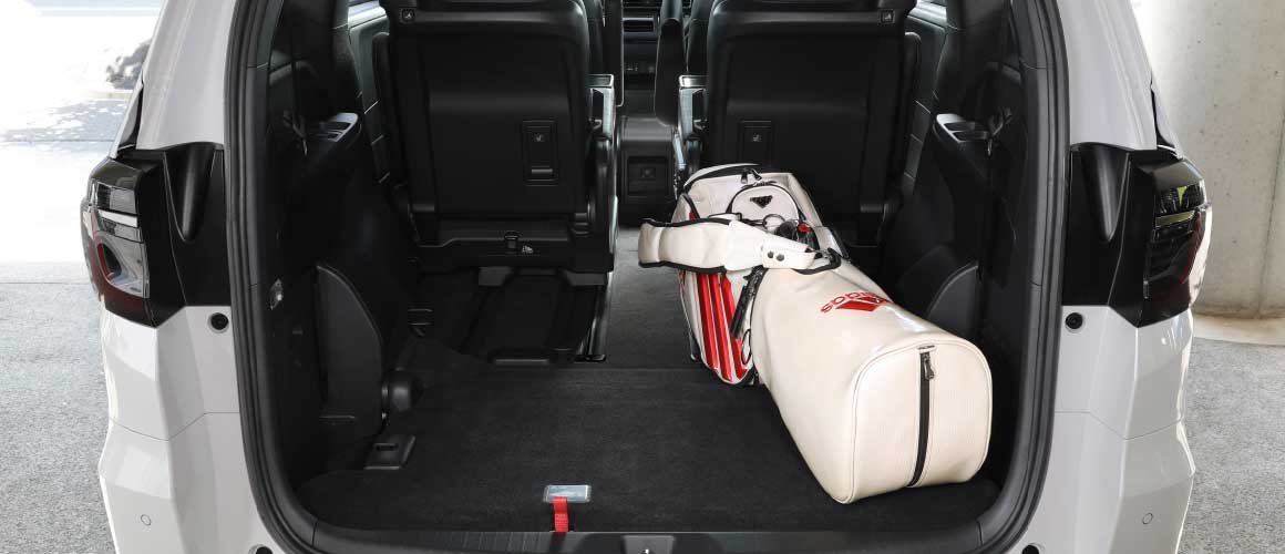 軽い力で3列目シートを格納し、ラゲッジスペースを拡大。ひろびろとしたフロアに、ゴルフバッグ4個をゆったりすっきりと載せられます。開口部も低いため、バッグを高く持ち上げることなく、スムーズに出し入れできます。