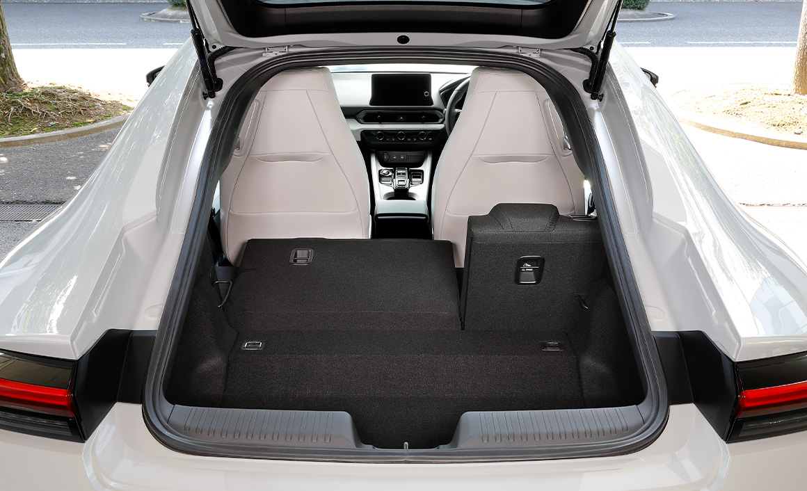 リアシート左側肩口のレバーを軽く引いて背もたれを前に倒し、荷室スペースを広げます。