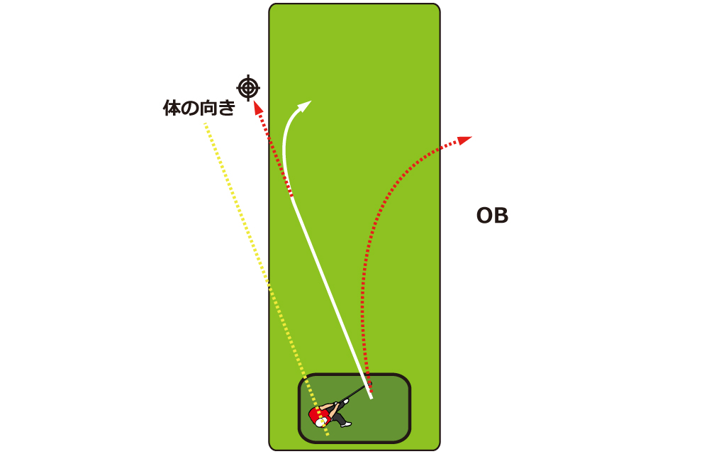 たとえばスライサーが右サイドOBのホールでティーショットを打つ場合、左の林方向を向いていつも通りにスイングをする人が多いでしょう。アライメント通りに打ち出せて、ボールが右に戻ってくればフェアウェイをとらえることができるという考え方です。