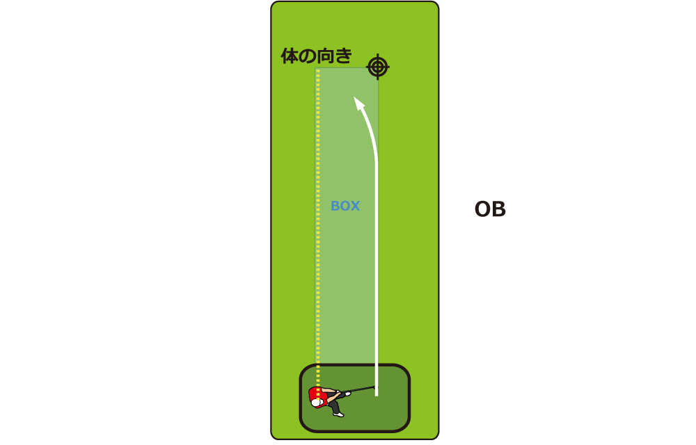 体の向きとターゲットラインでつくる四角いBOXの中にボールを収めるように打つのがBOX理論。右に曲がるとBOXを出てしまうのでドローボールが基本の球筋となる。