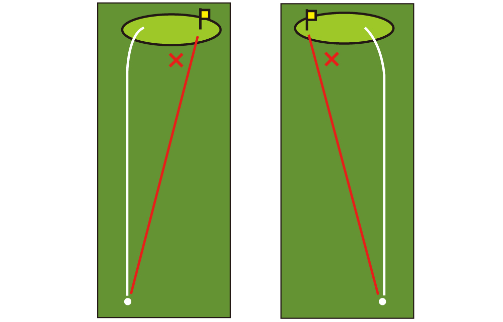 この理論でホールを攻略する場合、右サイドを狙う場合はティーマークの右端から打ち、左サイドを狙う場合はティーマークの左端から打ちます。斜めを向いて打つことには、人間の感覚を狂わせる要素がたくさん詰まっているという考えに基づいたコースマネジメントであり、ボールを動かせない2打目、3打目はどうすればいいかというと、ボールを曲げてターゲットに近づけるという方法をとります。右サイドから左サイドのピンを狙う場合はドローボールで攻めるということですね。