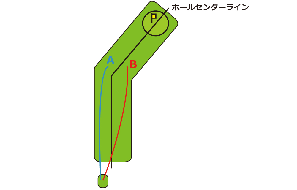 右ドッグレッグでティーグラウンドが左サイドにある場合は、ホールセンターラインと平行に立って打つAがおすすめ。Bはホールに対して斜めに立つのでスイングが崩れる可能性がある。