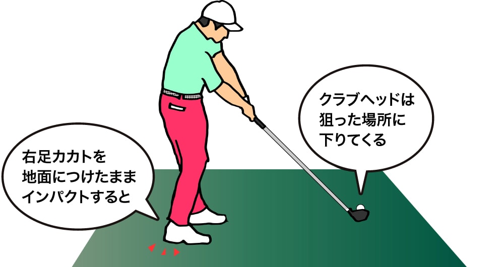 インパクトするまで右足カカトを地面につけておく