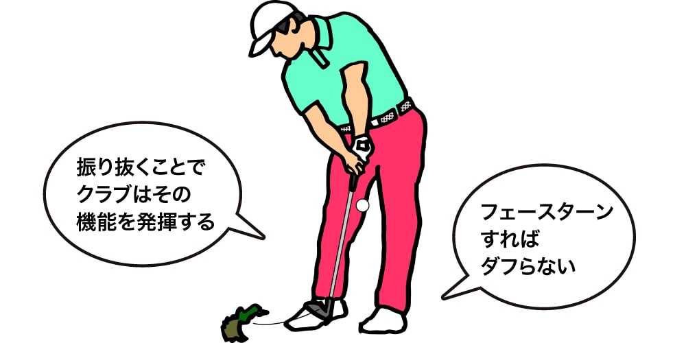 ゴルフクラブというものは、振り抜くことで適度にフェースターンが起こるように設計されているので、インパクトでフェース面をスクエアにして終わり、というような打ち方をするとダフりやすいですし、うまくとらえたとしてもボールは右へ飛んでしまいます。