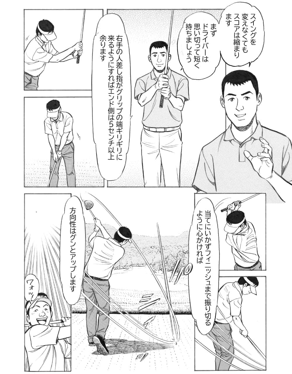 コースで「ドライバーを使わない」という作戦をとる人がいますが、あまりおすすめできません。スプーンやクリークでのティーショットはコース慣れした人にとっては簡単でも、たまにプレーする月イチゴルファーにはハードルが高いのです。だったらドライバーを短く持って打ったほうが確率が高いというもの。イマドキのクラブは基本的に曲がらないので、当てにいかず振り切ってください。決して「飛ばそう」などと欲張らず、むしろ「飛ばなくてもいい」ぐらいでいいのです。とにかく振り切ることに集中し、結果は後からついてくる、という割り切った気持ちが大切です。