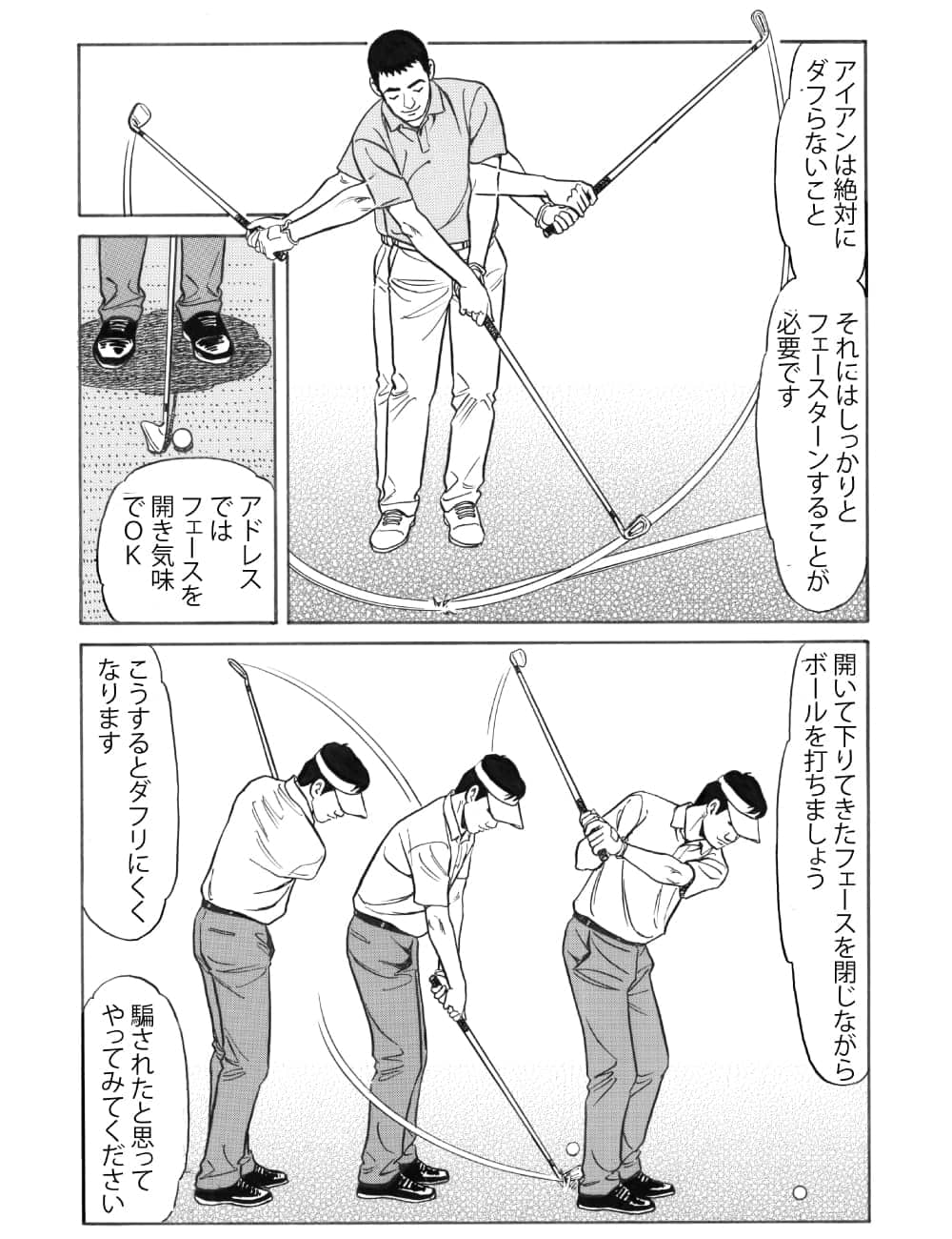 それには、必ずフェースターンするように心がけるのがポイント。フェースを閉じておいてボールにぶつける人がいますが、それだと思わぬミスが出てしまいます。アドレスでフェースはむしろ開き気味でOK。バックスイングしたら、開いたフェースを閉じながらボールをヒットすれば、ダフリにはならないはずです。この技はフェアウェイバンカーでも使えるので18ホールやり切ってください。
