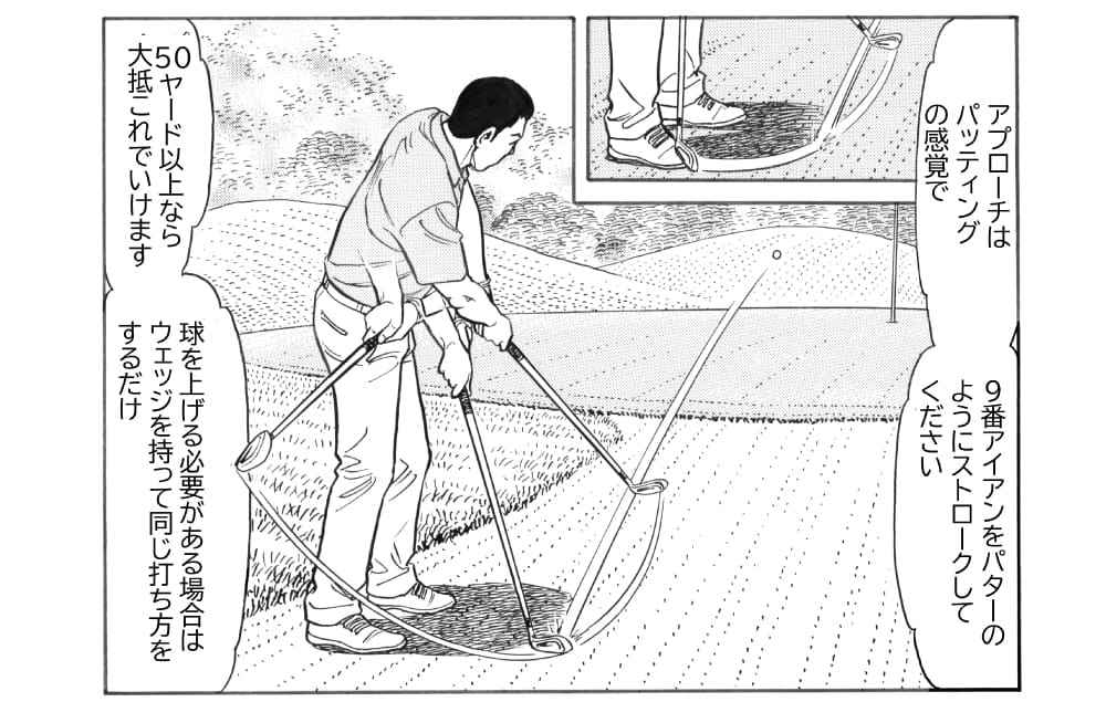 久しぶりのゴルフでアプローチショットがうまく打てるわけがありません。だったらグリーンに近づいたら転がすのが得策というもの。パターで打てればパターで、ちょっと無理そうなら9番アイアンで転がしてみましょう。ここで注意すべきは慣れないアプローチをやるとザックリしたり飛び過ぎてしまう可能性が高いので、パッティングストロークで打つことです。持っているのが9番アイアンであれサンドウェッジであれ、パターだと思ってストロークしてください。意外なほどうまく打てることに気付くはずです。