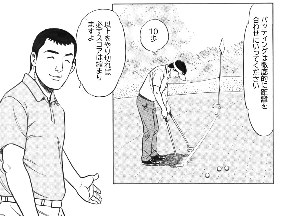 100を切るぐらいのレベルではパッティング数でスコアが大きく変わってくるものです。たいていの場合は40パット以上しているものなので、これを減らしましょう。それには3パット4パットをなるべくしないことが重要で、距離感がカギになります。ロングパットは最低でも1ピン以内に持っていくことを考えて打ちましょう。ショートパットも方向にこだわり過ぎは禁物。スロープレーのもとですし、それよりは距離を合わせたほうが案外入ってくれるものです。最悪3パットは仕方がないとしても、4パットは絶対にしないようにしましょう。