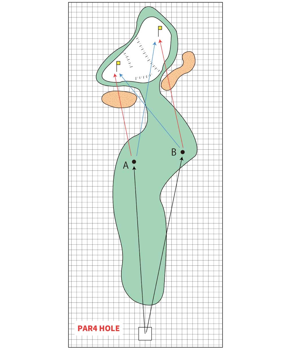 ピンポジションによってどれくらい攻め方が変わるかというと、たとえば図のパー4の場合、カップが左手前に切ってある場合と右奥に切ってある場合とでは、ティーショットの狙いが変わってきます。