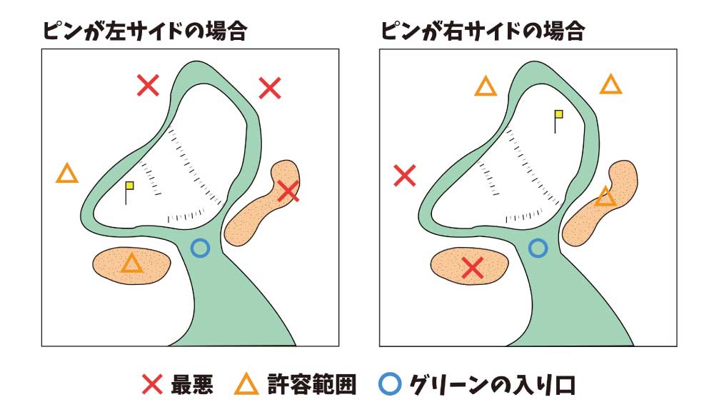 一方、ピンが右奥の場合、右サイドからだとグリーンを広く使えなくなり、バンカーにもかかります。グリーンの左には乗せやすいですが、グリーンのアンジュレーション(起伏)がきつかったりすると3パットの可能性が高くなってしまいます。だったら左サイドからグリーンを広く使って第2打を打ち、最悪右のバンカーでもいいと思って打ったほうがボギーを叩かなくて済みます。