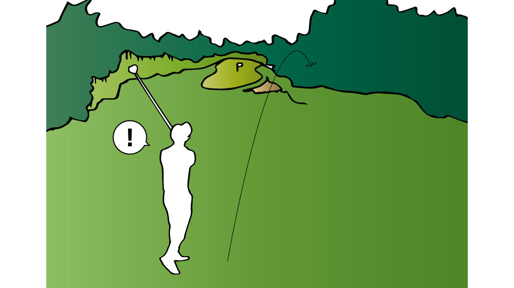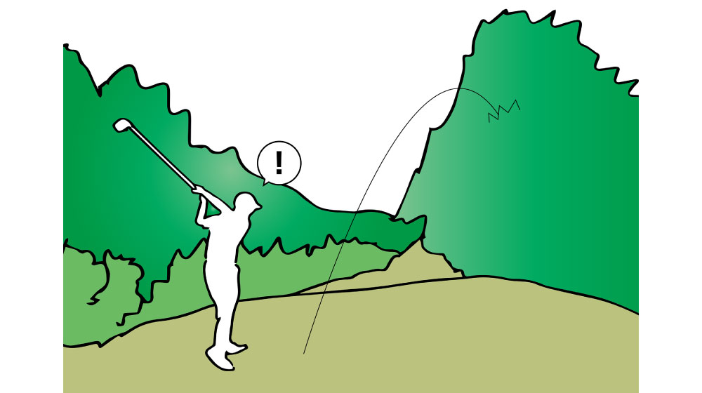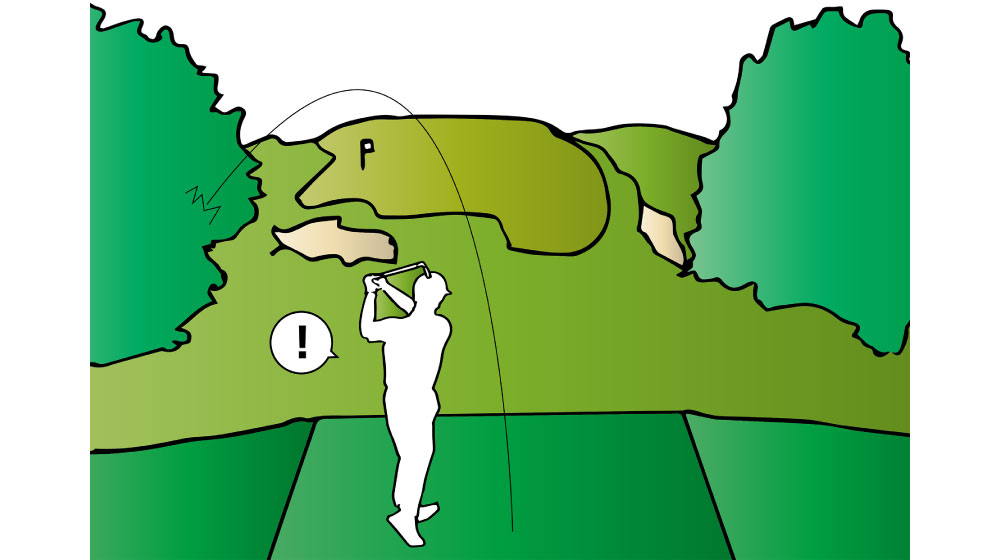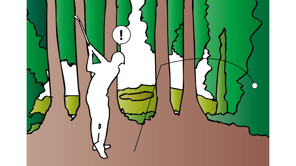 ボールが曲がって林の中に入るのは仕方ありませんが、問題なのはその後です。グリーンが見えているからといって、狭い木と木の間を通すギャンブルショットを打っていませんか? プロなら可能かもしれませんが、そんな技量はないのですからボールが木に当たってさらに深い林の奥へ、というのは当然の結果です。ですからここは無理をせず、いったん真横に出すのを決めごとにしてはどうでしょうか? ミスは1打で済ませることがスコアメークの鉄則です。