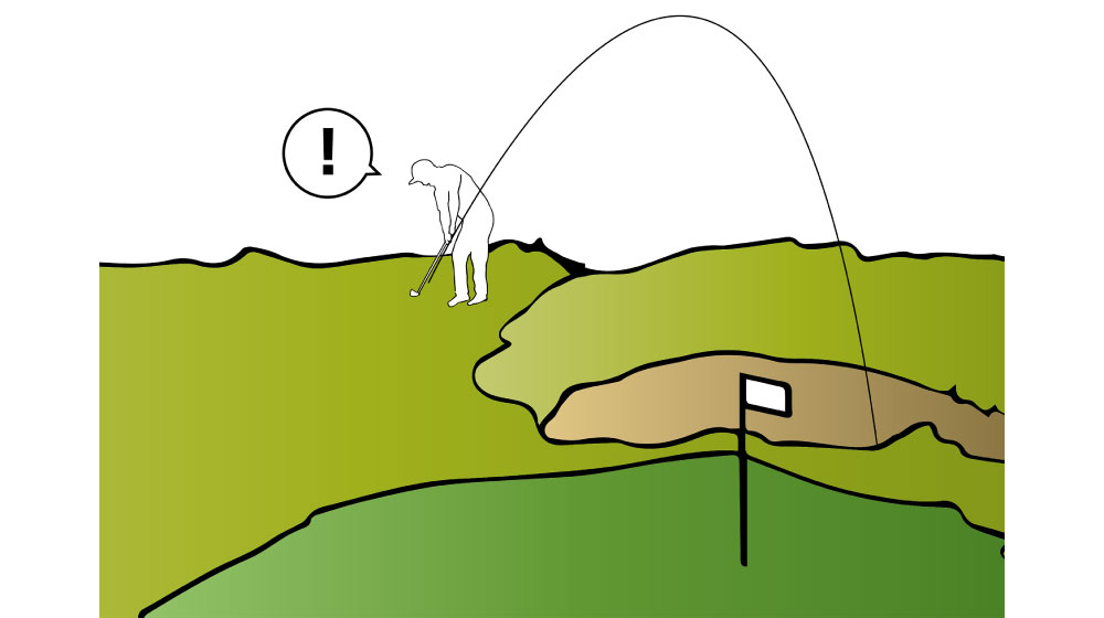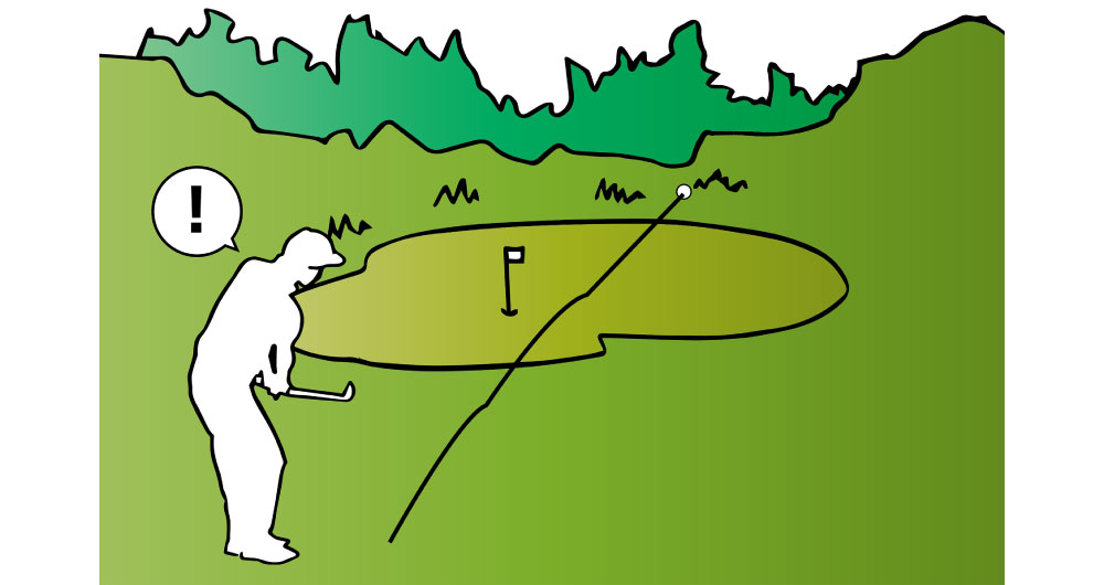 これを防ぐには、アプローチで使うクラブを決めておくことです。できればパター、さもなくば9番アイアンを使うといいでしょう。9番アイアンをパターのように打てば、ウェッジの刃に当たるようなトップは出ません。手前の芝に食われてショートすることもありますが、手前から着実にピンに近づけていくことで、無駄なストロークを費やさずに済みます。