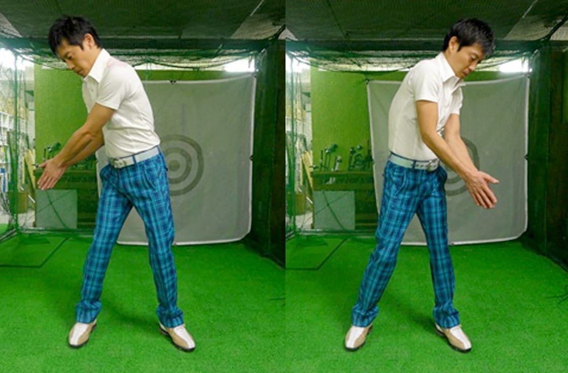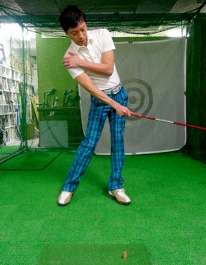 1つめは左手で右の二の腕を押えておいて右手でクラブを振るドリルです。