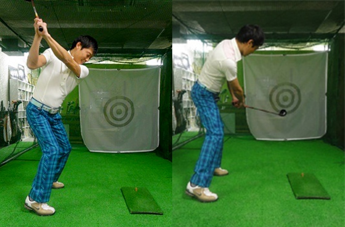 100を切れないレベルのアマチュアのほとんどがダウンスイングで右肩が前に突っ込んでいます。右手で打ちにいくからそうなるのですが、クラブが外から下りてくるしかないのでアウトサイドインのスライスになります。それを嫌がってフェースを無理やり閉じると今度はボールが左に飛び出してしまう。