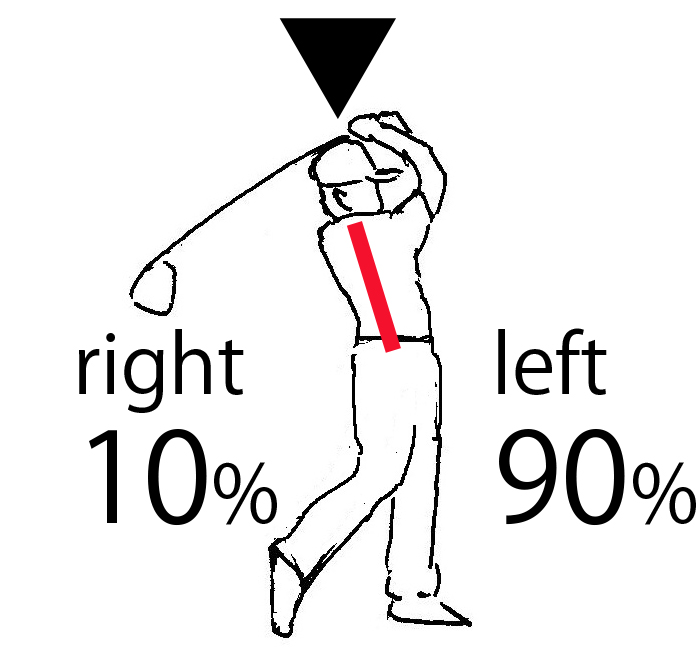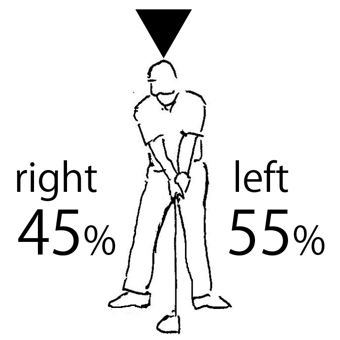 具体的にどうするかというと、まずアドレスでは体重を55:45の割合で左足に寄りかけておく。そのまま体重移動せずにバックスイングし、左足に乗りながらダウンスイング。インパクトでは体重配分が80:20になり、フィニッシュでは90:10になる、というのが彼らの主張だ。スイングの回転軸は背骨で、アドレスの位置から頭を動かさずに打つ。そのためにバックスイングでは右脚が伸びるとともに、体がやや左に傾いた形になり、のけぞるようなフィニッシュになるのがこの打法の特徴だ。