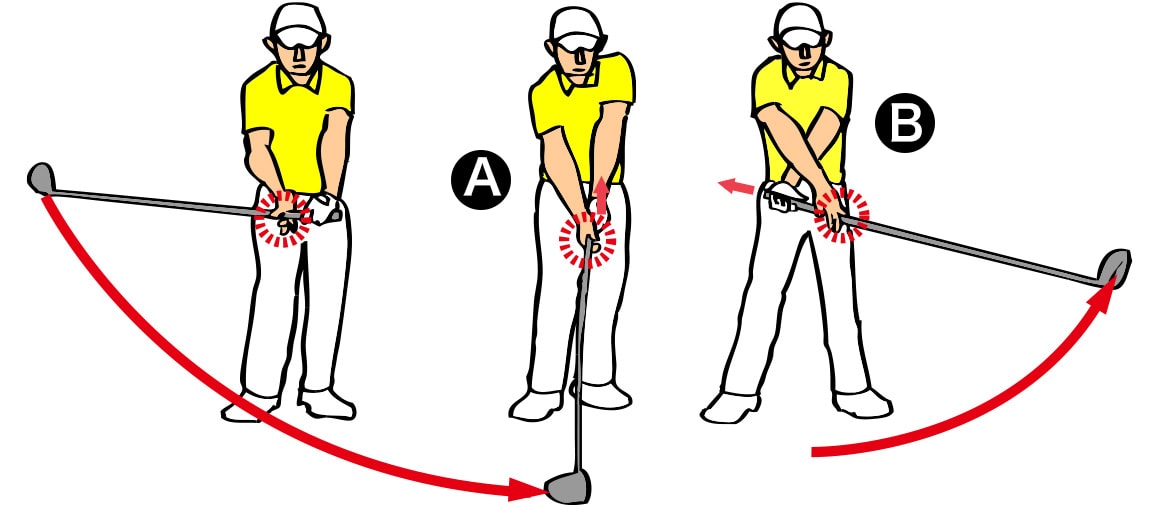 B:左手でグリップエンドを目標と逆方向に引くと右手を使わずにクラブヘッドが振り出される。