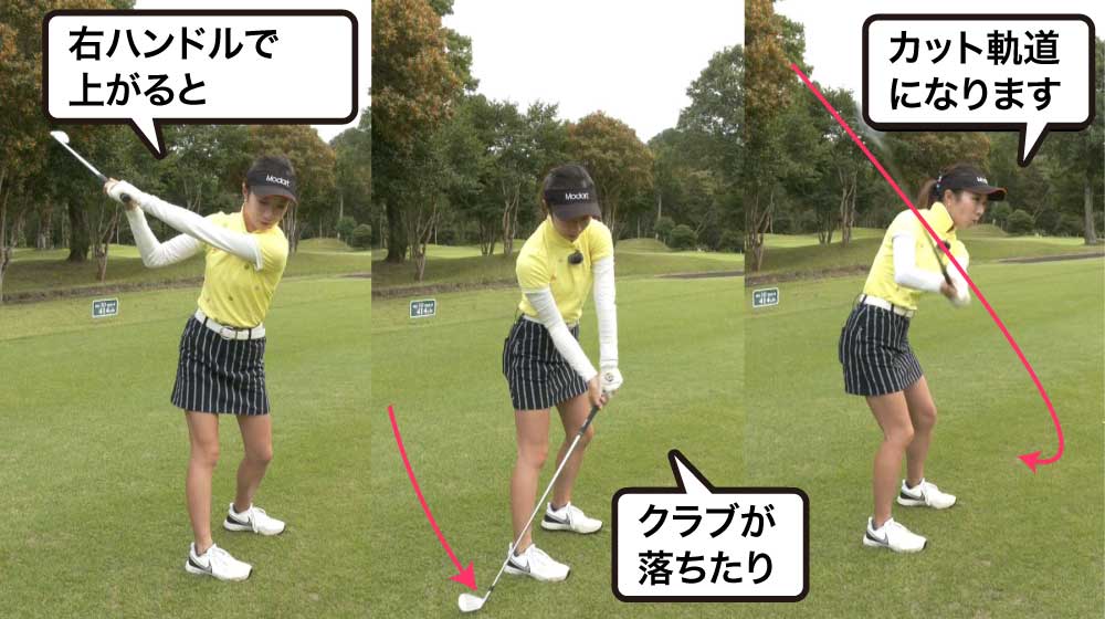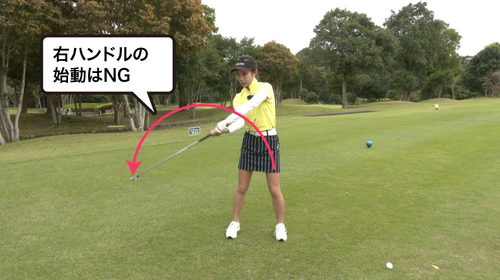右ハンドルといってテークバックでいきなりクラブを右に回してしまうと、切り返しでは逆に左にハンドルを切るような動きになります。これだとクラブは外から入るので、スライス系の球になりやすいですし、球質も良くありません。
