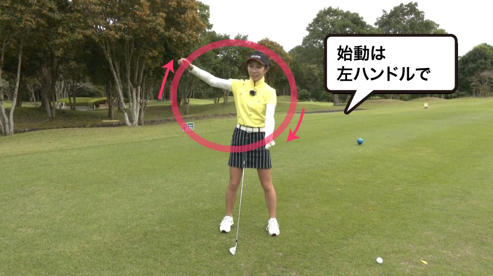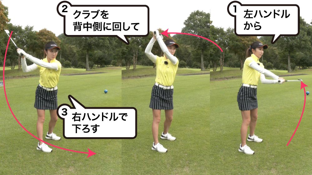 まず左ハンドルを効かせながら、クラブをフォロー方向に振り上げちゃうんですね。そこからトップの位置に持ってくるんですけど、感覚的には頭の上でクラブを回しながら下ろしてくるんです。