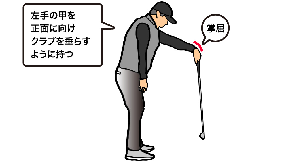 まず左手でクラブを持ち、甲を正面に向けながらクラブを垂らすように持ち上げてください。こうすると左手首は掌側に折れ、おばけが「恨めしや~」と登場するときの形になります。これが「掌屈」であり、この形でボールをとらえればフェースは開きません。