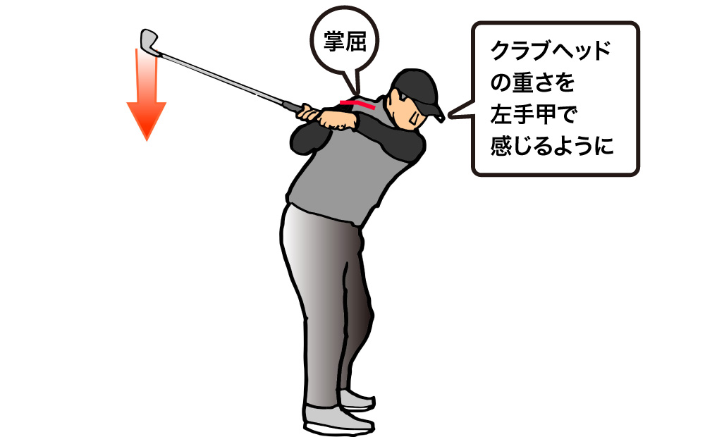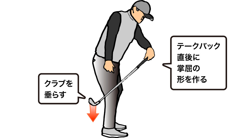 アドレスしたらテークバック直後に左手を掌屈してトップを作る。このときのポイントはクラブを垂らすように手元を持ち上げる。