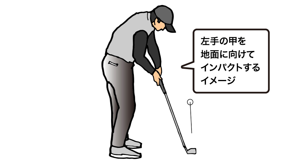 このコンパクトなトップからクラブを振り下ろすが、手元とクラブの形は変えず、左手の甲を下に向けるイメージでインパクトする。
