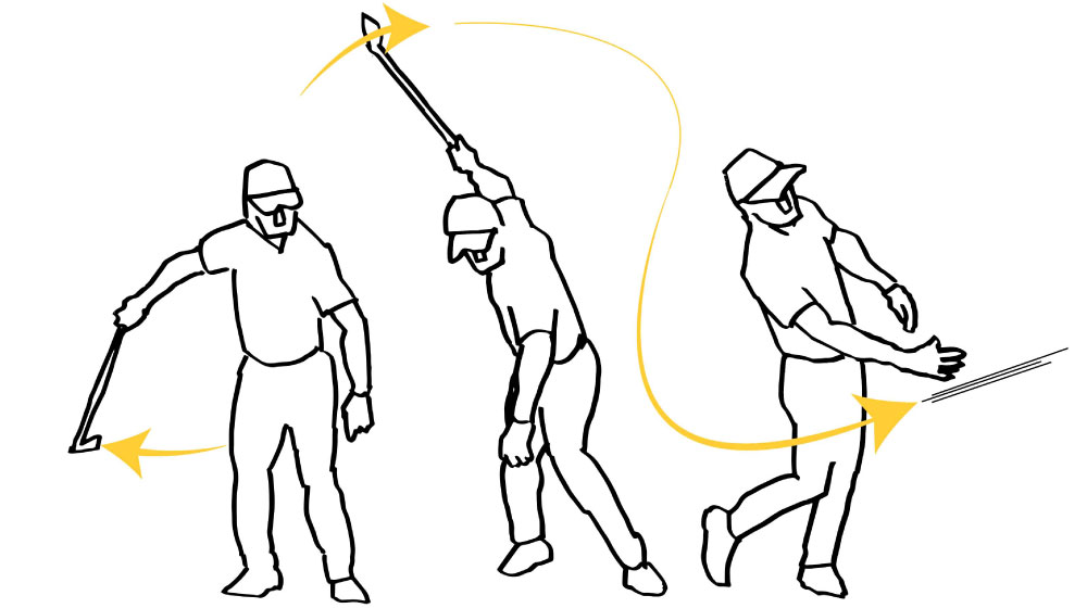 クラブを遠くに放り投げようとすると、始動でヒジを外側に振り出し、自分から見てクラブを右回りさせて投げるのが自然な動き。