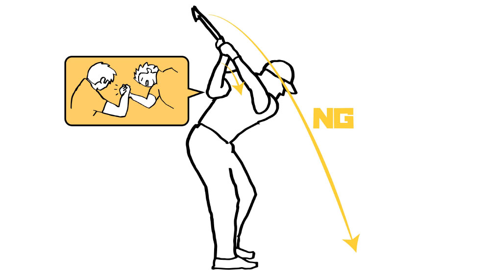 バックスイングがどんなにいいポジションに上がっても、切り返しで利き腕に腕相撲に勝つ動作が入ってしまうと、クラブは左回りして外から下りてくる。