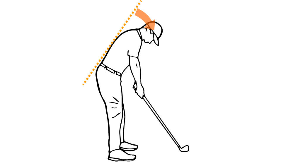 頭の位置は前に垂らさず、背骨から後頭部のラインがまっすぐになるようにします。こうすることでバックスイングが大きく取れますし、回転がしやすくなるのでボディターンのスピードが上がり、飛距離が伸びるでしょう。