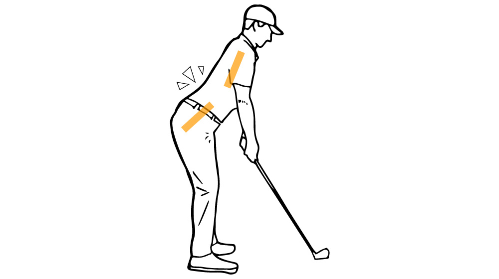 骨盤が前傾し過ぎて胸郭と向きが合わなくなっている状態。反り腰で構えると体のターンがスムーズにいかないし、腰に負担がかかって故障しやすい。