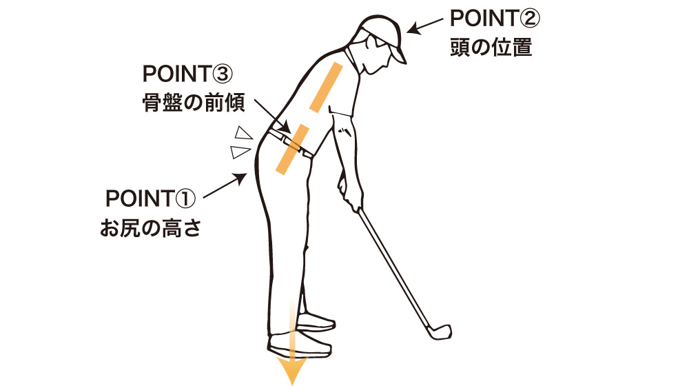 では、ショットを安定させるためにどういうアドレスをとればいいのかというと、ポイントは3つあって①お尻の高さ、②頭の位置、③骨盤のポジションです。
