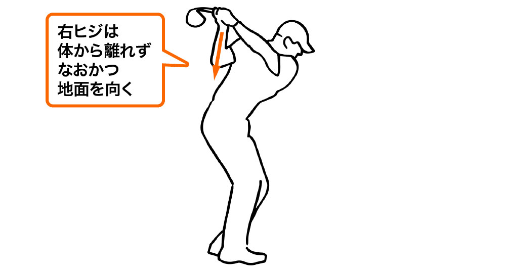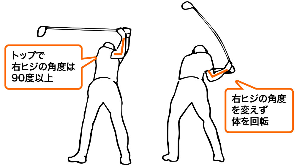 トップにおける右ヒジの角度は直角と言われますが、何もしなければ90度以上になるのでそれが正解です。腕を長く使えば右ヒジの角度は大きくなり、短く使えば角度は小さくなりますが、絶対に90度以下にならないようにしましょう。