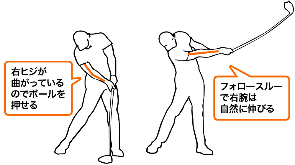 これがボールを押せる形であり、飛距離と精度を両立できるインパクトの形といえます。ボールをとらえた直後に右腕は伸びますが、これは意識して行う動作ではありませんし、打ちたい球筋によって右腕が伸びるタイミングは変わってきますので自然に任せるようにしましょう。右ヒジを伸ばしにいくと、フェースが開いたり極端にアウトサイドに振り出したりしてしまい、球がつかまらなくなります。