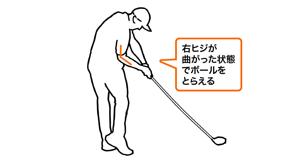 右ヒジの角度をキープしたままダウンスイングした結果、ハンドファーストかつ右ヒジが曲がった状態でインパクトを迎えます。