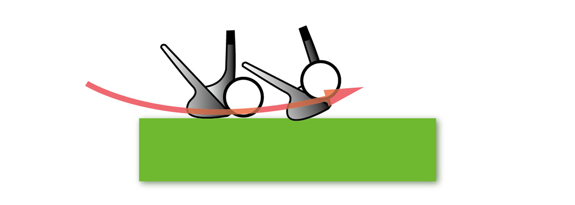 では、どうやったらイマドキのボールにスピンがかかるかというと、ロフト通りに打って柔らかく飛ばすことです。以前の打ち方はハンドファーストに構えロフトを立てて当てていましたが、イマドキのアプローチはハンドファーストにせず、芝の上でソールを滑らせるように打ちます。そうすることでフェースにボールが乗りふわっと柔らかい球になるのです。強烈なスピンはかかりませんが、柔らかさと高さで球は止まります。