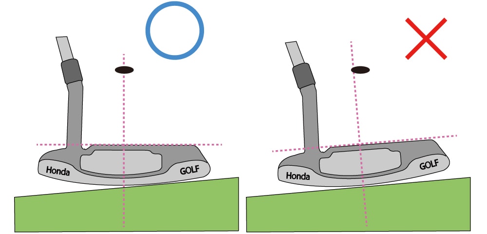これが何を意味するかというと、ラインを読むだけではなく、打ち方も斜面に対応する必要があるということです。たとえばつま先上がりに立っている場合、パターのソールをグリーン面にぴったり付けて構えると、ロフト角がついているのでフェースは左を向きます。フックラインなのでカップの右に打ち出そうとするでしょうが、このセットアップからだと、打ち出そうとする方向よりもボールは左に出てしまうのです。結果はカップの左に外れることになりますが、フェース面が左を向いていたことに気付かず「思ったよりも切れたな」などと考えて次のホールに向かってしまうと、また同じことが起こります。