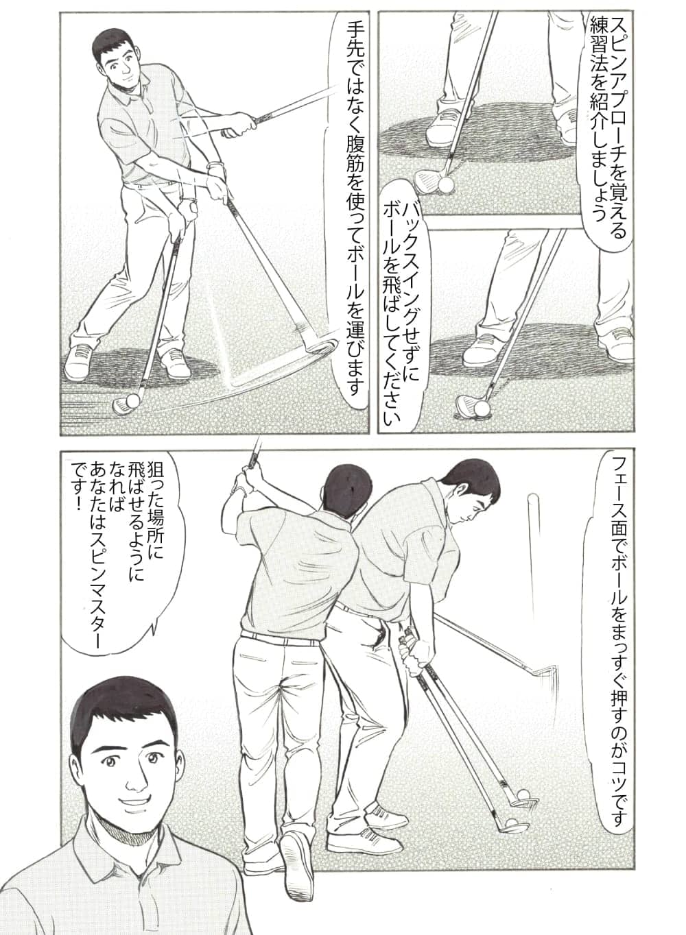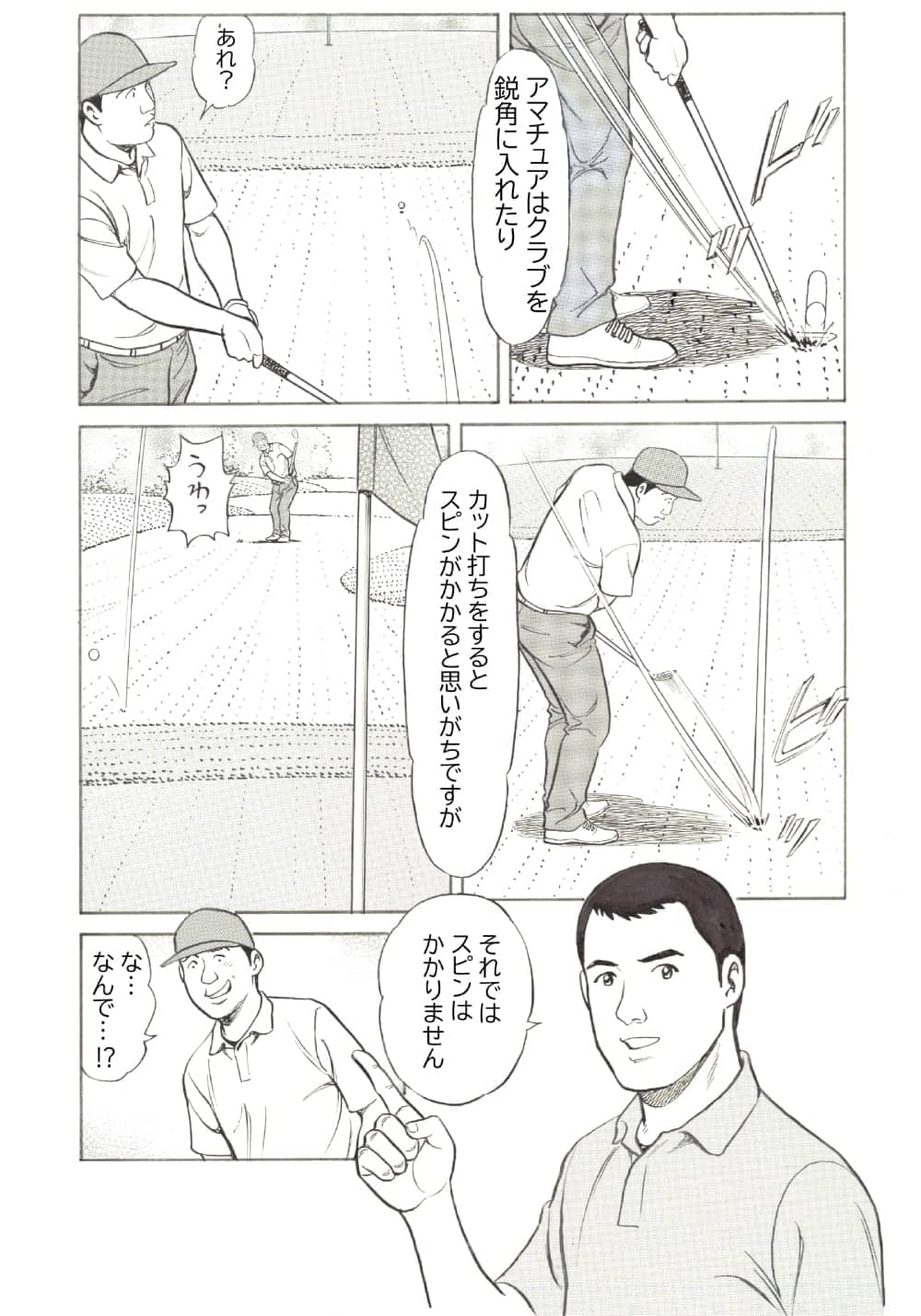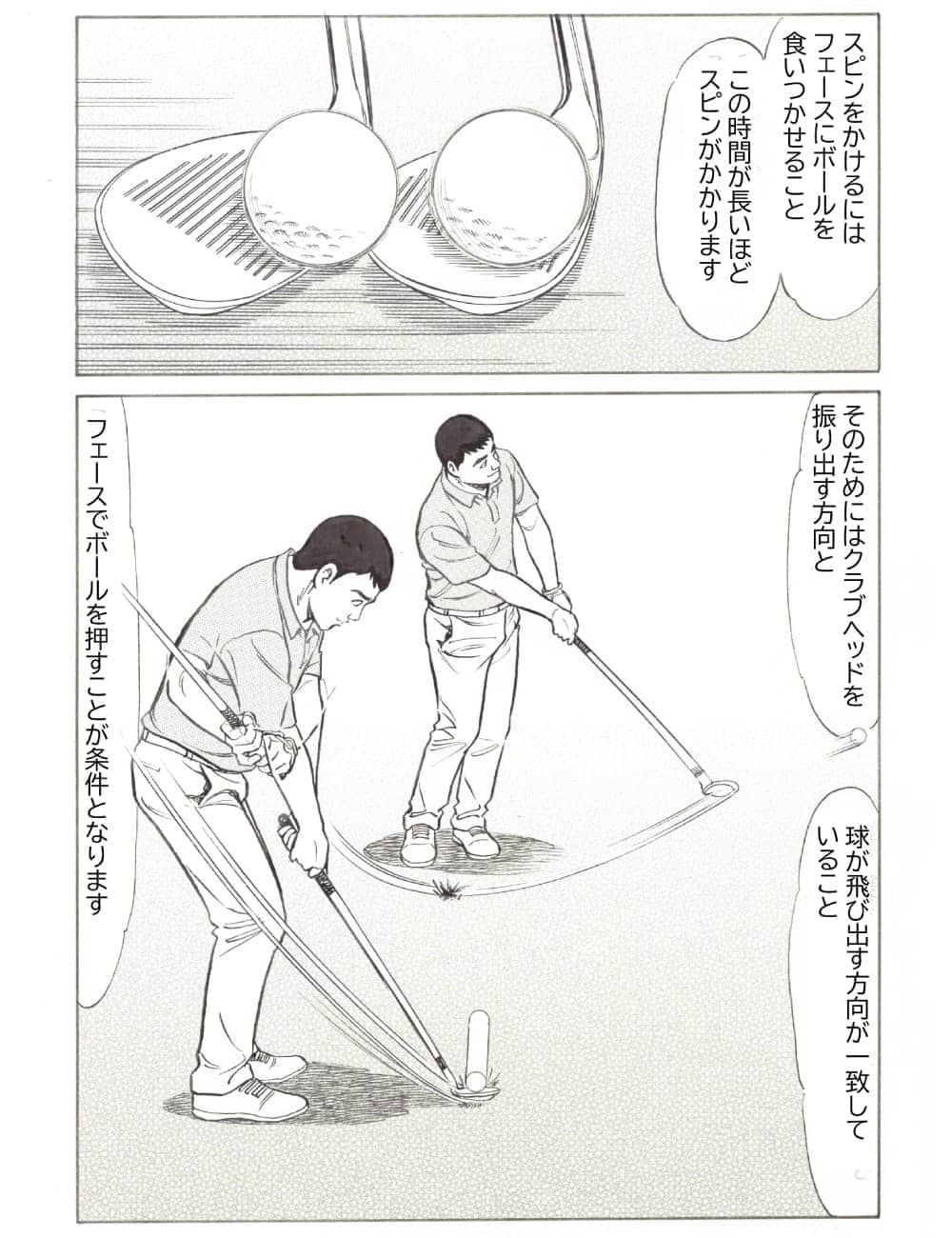 鋭角に入れるだけだと前に飛ぶ球になりますし、ただ切るだけだとボールは上に飛ぶだけです。前者は「クラブは地面にぶつかって止まり、ボールは前に」、後者は「クラブは左に振り抜かれ、ボールは上に」という具合に、クラブを振り出す方向とボールの飛び出す方向が一致していないので、いわゆる「球離れが早い」という状態になり、スピンがかからないのです。