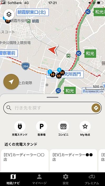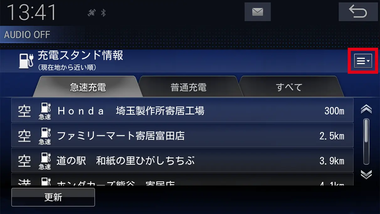 現在地から近い順で、充電スタンドの名称と距離が表示されます。また、右上のメニューボタンから「目的地に近い順」を選べば、目的地周辺の充電スタンドを検索できます。
