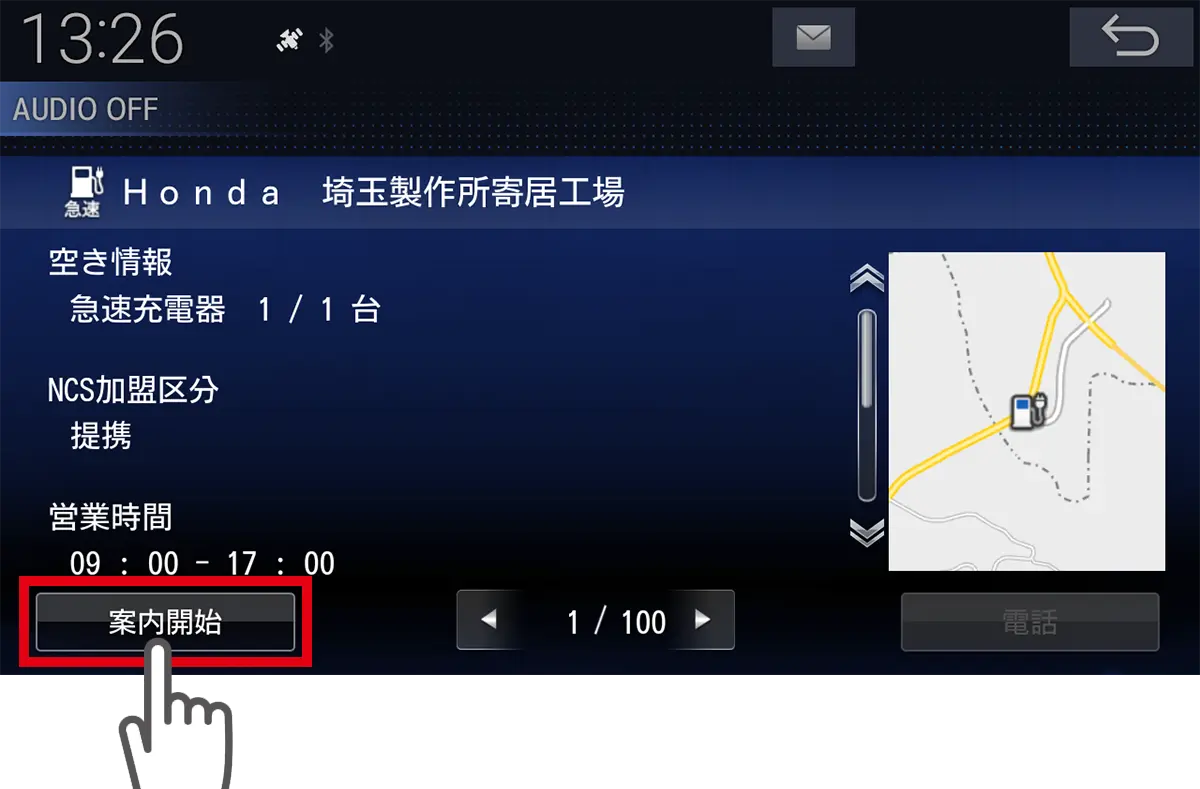 名称を選択すると、営業時間などの詳細情報を確認できます。【案内開始】を選択すると、地図上で位置を表示し、目的地等にしてルートを検索することができます。