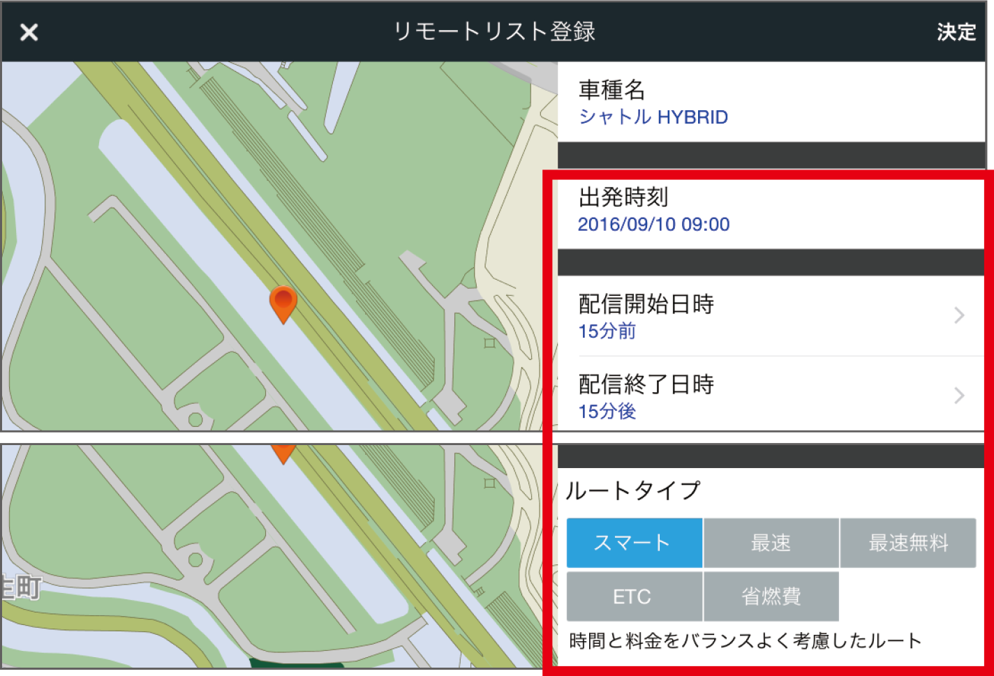 [リモートリスト(目的地クリップ)登録] 画面が表示されて出発時刻、配信開始日時、配信終了日時、ルートタイプを設定。