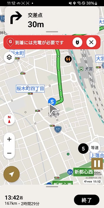 警告通知をタップすると目的地周辺の充電スタンドが表示されます。