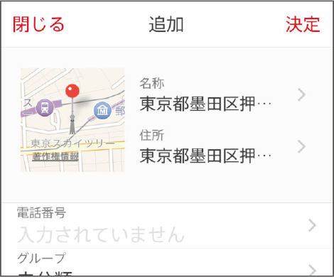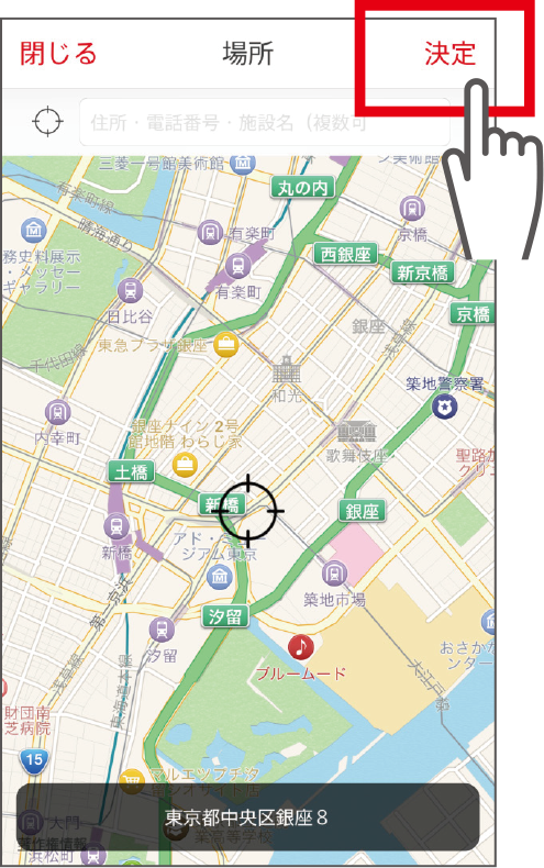 地図もしくはキーワード検索で場所を選び、[決定]をタップ。