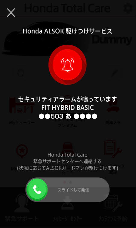 セキュリティアラーム通知画面からも緊急サポートセンターへ電話をかけることができます。