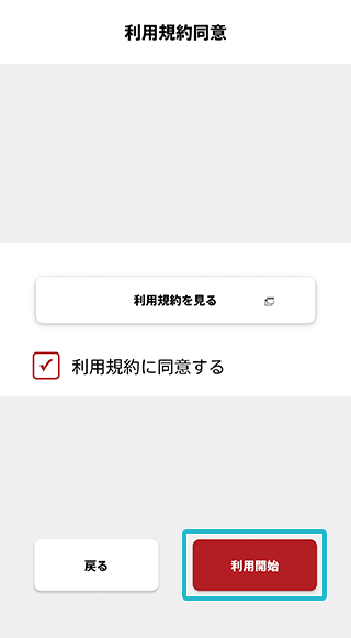 チュートリアルの後、利用規約を確認の上同意欄にチェックし「利用開始」をタップ。
