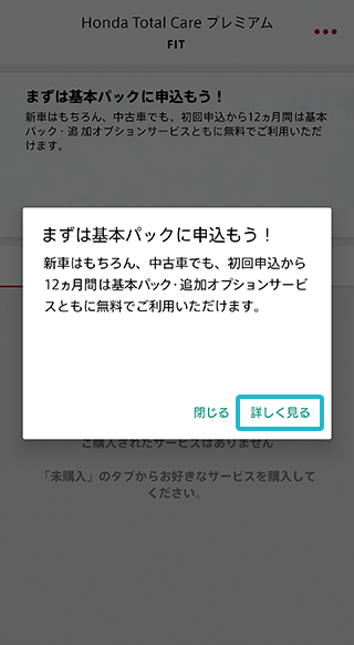 基本パックの申込案内のポップアップが表示、「詳しく見る」をタップ。