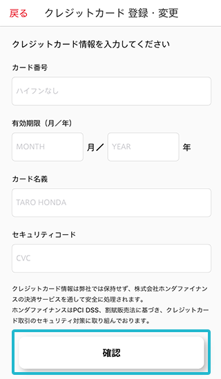 クレジットカード情報を入力し、「確認」をタップ。