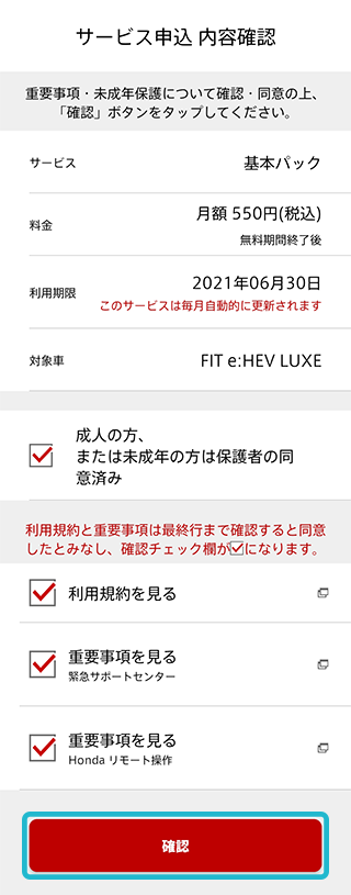 Honda ALSOK駆けつけサービス申込画面にて内容確認後、利用規約・重要事項を最終行まで閲覧し、同意欄にチェックが入ったのちに、「確認」をタップ。本人認証コード入力後、申込完了。