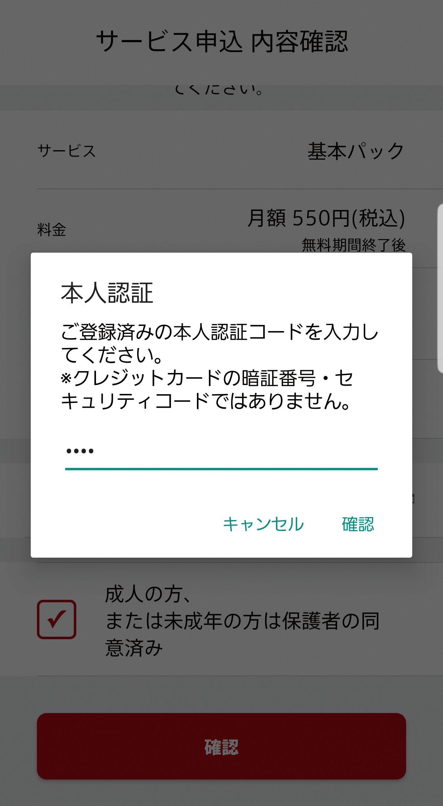 クレジットカード情報登録後、続けて本人認証コード登録のポップアップが表示。