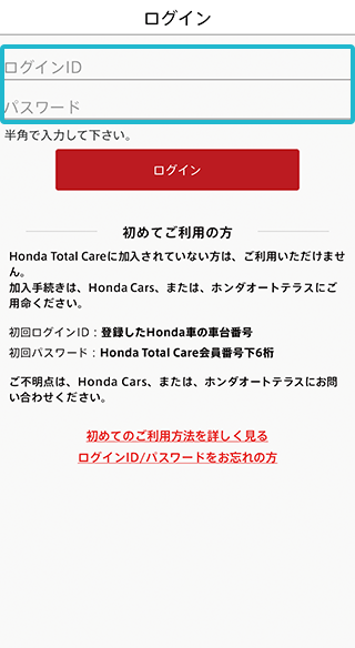 アプリを起動、ログイン画面にHonda Total CareのログインIDとパスワードを入力、「ログイン」をタップ。
