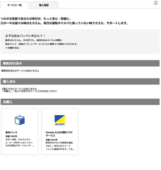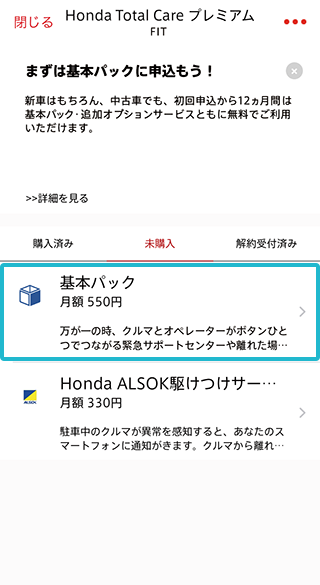 「未購入」タブから「Honda ALSOK駆けつけサービス」をタップ。